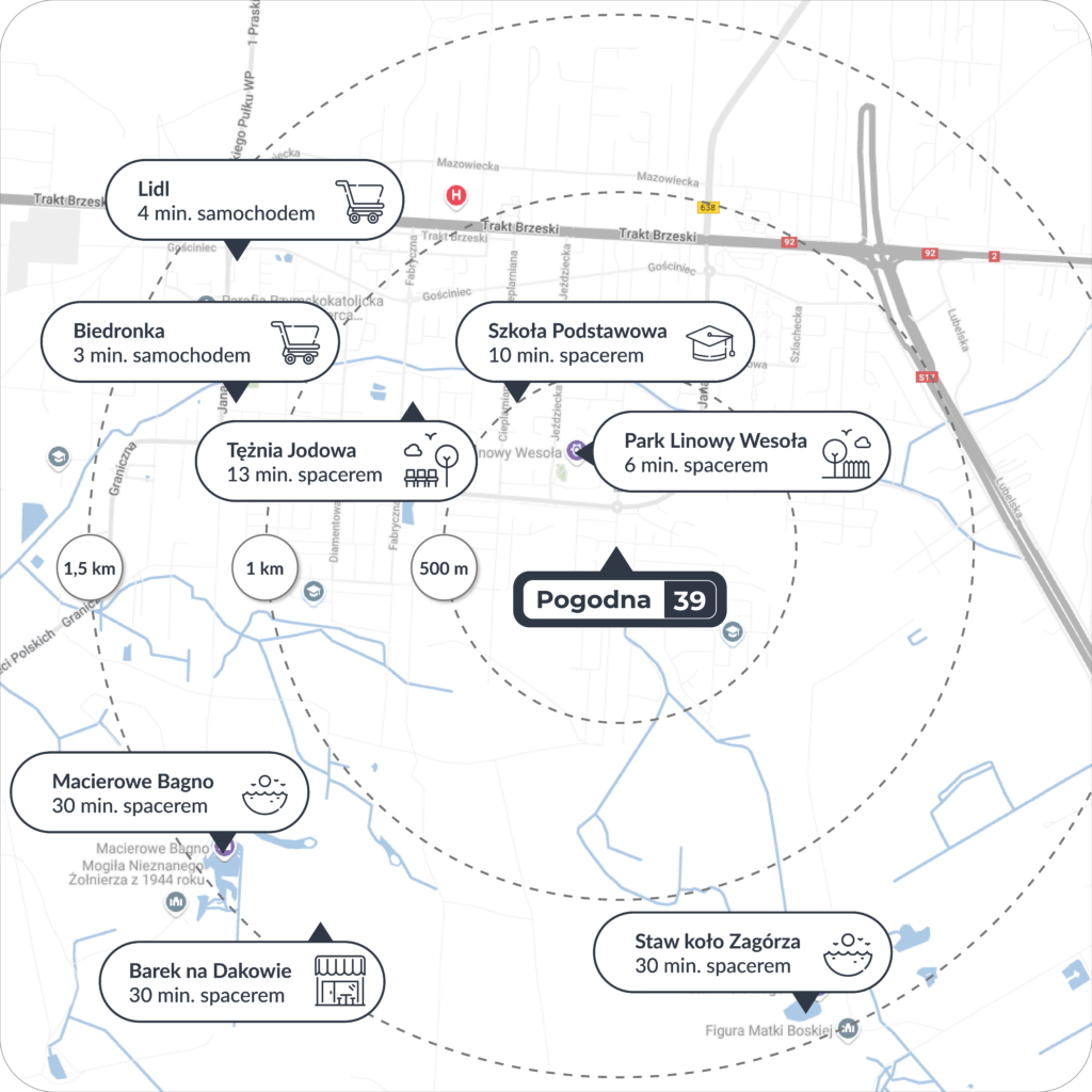 Pogodna 39 to miejsce, gdzie komfort codziennego życia łączy się z przyjaznym otoczeniem osiedla Stara Miłosna. W sąsiedztwie znajdują się szkoły, przedszkola, place zabaw, a także liczne sklepy, restauracje i punkty usługowe, co zapewni Ci wygodę. Pobliski Park Linowy Wesoła oraz piękne tereny zielone oferują dodatkowe możliwości aktywnego spędzania czasu na świeżym powietrzu. Okolica jest spokojna i bezpieczna, idealna dla rodzin z dziećmi, które cenią sobie łatwy dostęp do wielu praktycznych udogodnień.