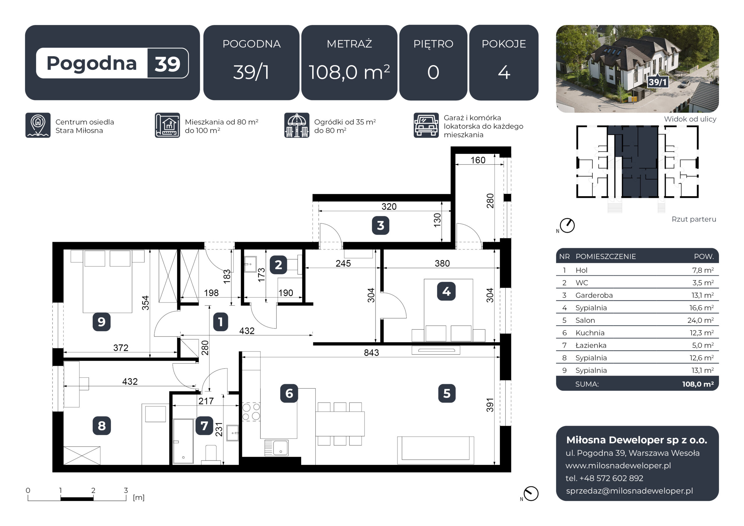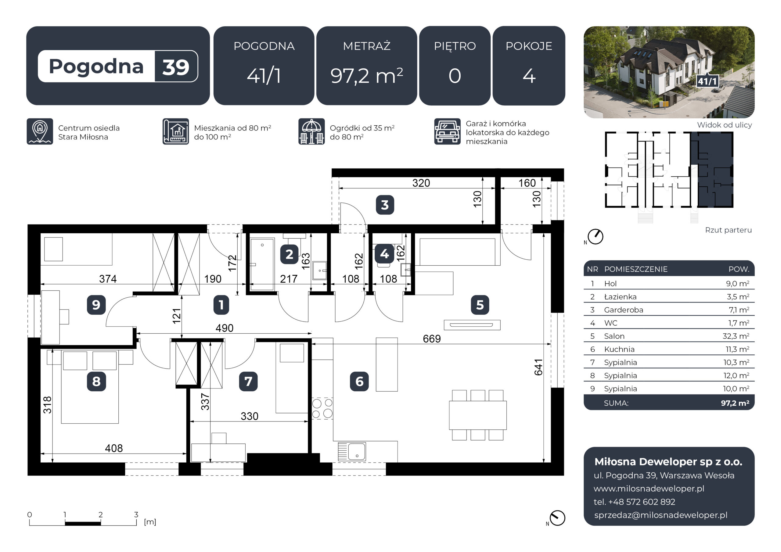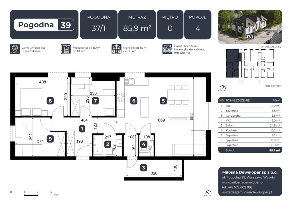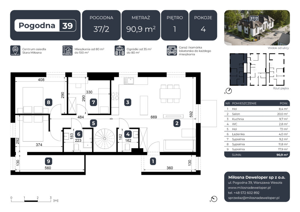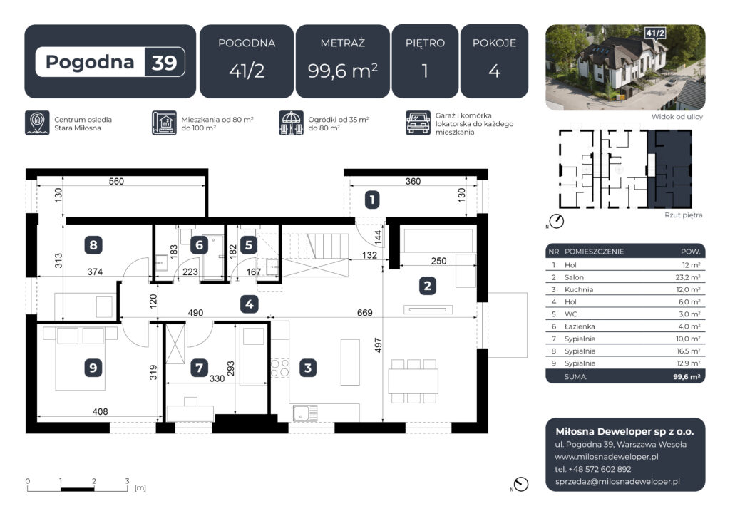 Inwestycja składa się z sześciu mieszkań o powierzchni od 87 m² do 110 m², zaprojektowanych z myślą o maksymalnej wygodzie przyszłych mieszkańców – w tym rodzin z dziećmi. Budynek wyróżnia się estetycznym, bardzo eleganckim wyglądem, który doskonale wpisuje się w otoczenie, oferując Ci komfortową przestrzeń do życia.